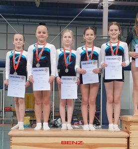 Nach einer insgesamt ausgeglichenen Mannschaftsleistung – alle erturnten sich rund +/- 51,00 Punkte -, guten Leistungen an allen Geräten und einem sturzfreien Schwebebalken erkämpften sich Jule, Johanna, Lea, Marie und Jana mit 155,70 Punkten die Silbermedaille und standen mit strahlenden Gesichtern auf dem Siegerpodest. Insgesamt waren 10 Mannschaften in AK 10/11 am Start.