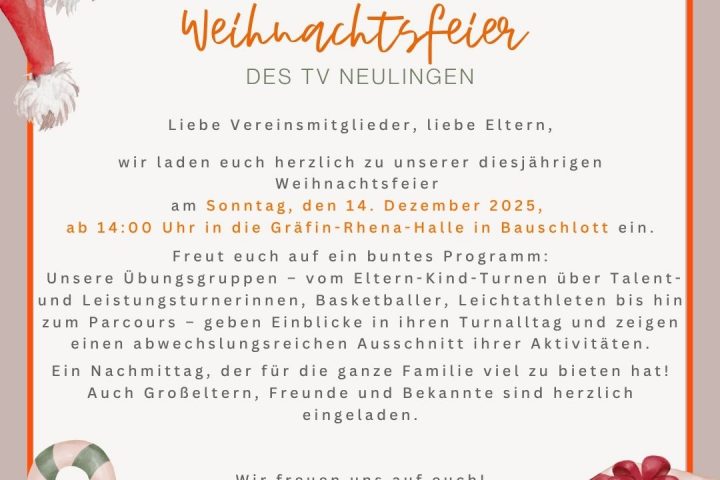 Liebe Vereinsmitglieder, liebe Eltern, liebe Neulinger Turnfreunde, wir laden euch herzlich zu unserer diesjährigen Weihnachtsfeier am Sonntag, den 15. Dezember 2024 um 14:00 Uhr in die Gräfin-Rhena-Halle in Bauschlott ein. Freut euch auf ein buntes Programm: Unsere Übungsgruppen, vom Eltern-Kind-Turnen über die Talent- und Leistungsturnerinnen bis hin bis zur Basketballgruppe und dem Parcours,...